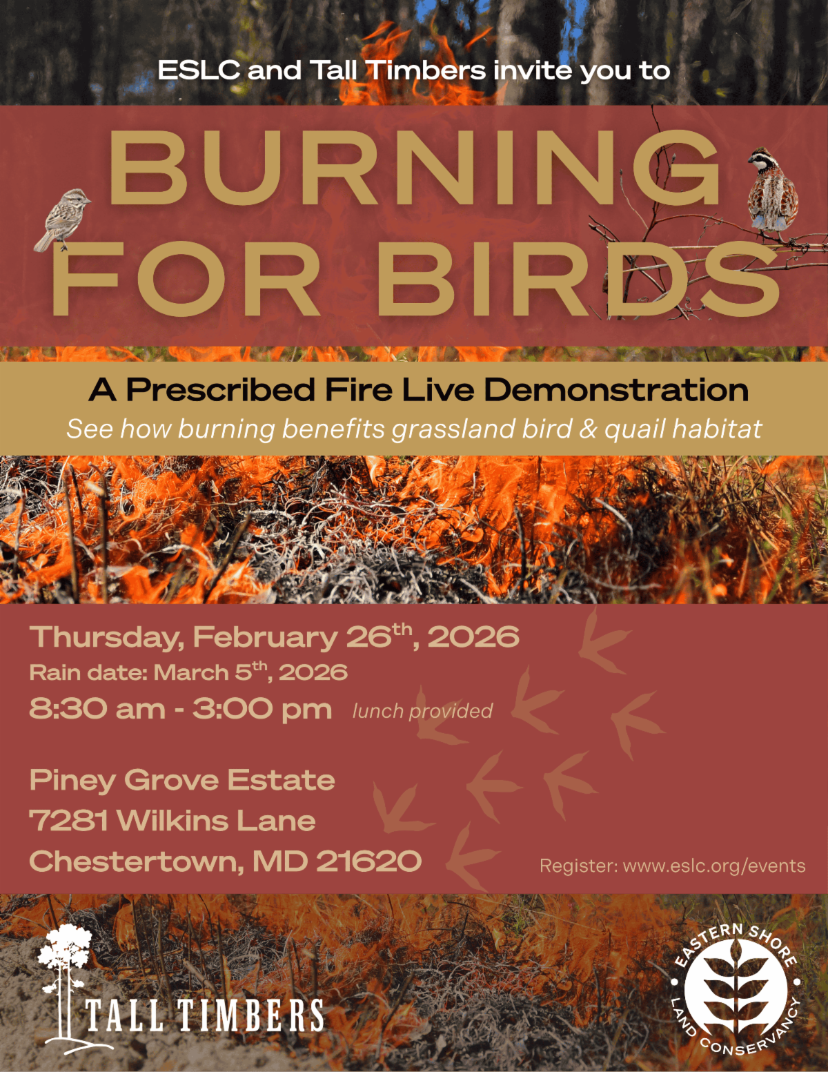 ESLC and Tall Timbers invite you to Burning for Birds: A Prescribed Fire Live Demonstration “Learn and Burn” event. Attendees will learn about the safe and efficient use of prescribed fire as a management tool and how its use benefits grassland bird and Northern bobwhite quail habitat. Part discussion and part live demonstration, guest speakers and participants include Dan Small and Katherine Thornton of the Natural Lands Project, Sam Leaverton of the Kent Soil and Water Conservation District, and Jack Hutchison of Quail Forever and the Natural Resource Conservation Service. Lunch will be provided!