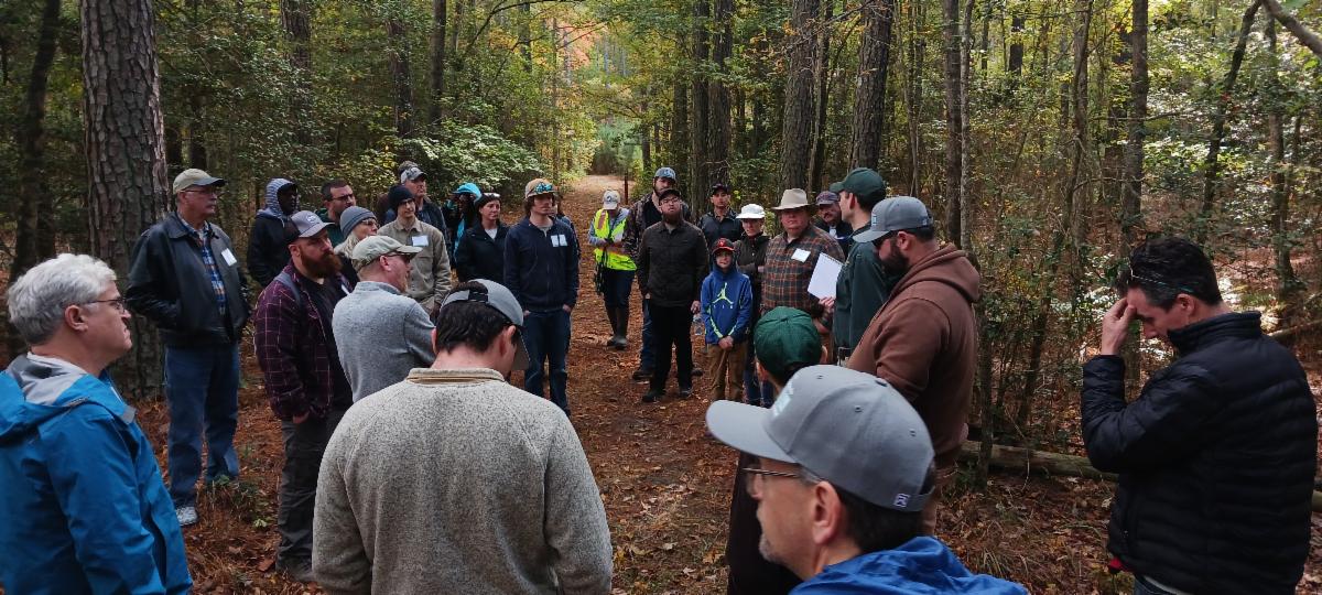 Delaware Wild Lands' most recent land protection project, the 233-acre Jezyk Farm in the heart of Taylors Bridge. (Photo Credit: Delaware Wild Lands) | | Delmarva Woodland Stewards Program Accomplishments | | | Course participants joined forestry professionals in the woods to learn about forest management. (photo credit: John Hooven)) | |