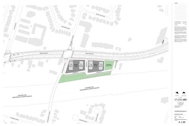 A private internal road adjacent to Highway 401 will connect the two phases. This road will have two restricted right-in/right-out accesses onto Kingston Road, in addition to the existing access from Rougemont Road.