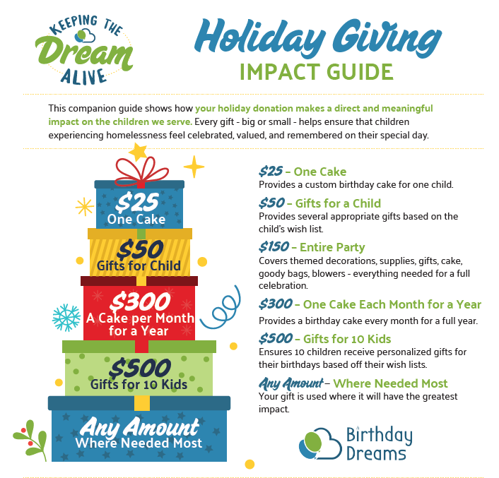 - Support our mission to celebrate children experiencing homelessness with the gift of a birthday