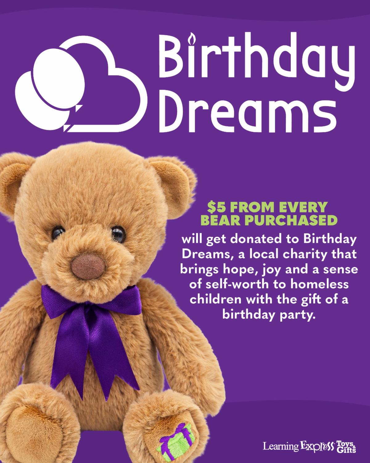 This month, if you purchase a toy bear at Learning Express Toys and Gifts, $5 from that purchase will be donated back to Birthday Dreams. What a great way for folks to shop local, spread cheer, and help make birthdays brighter this Holiday season!