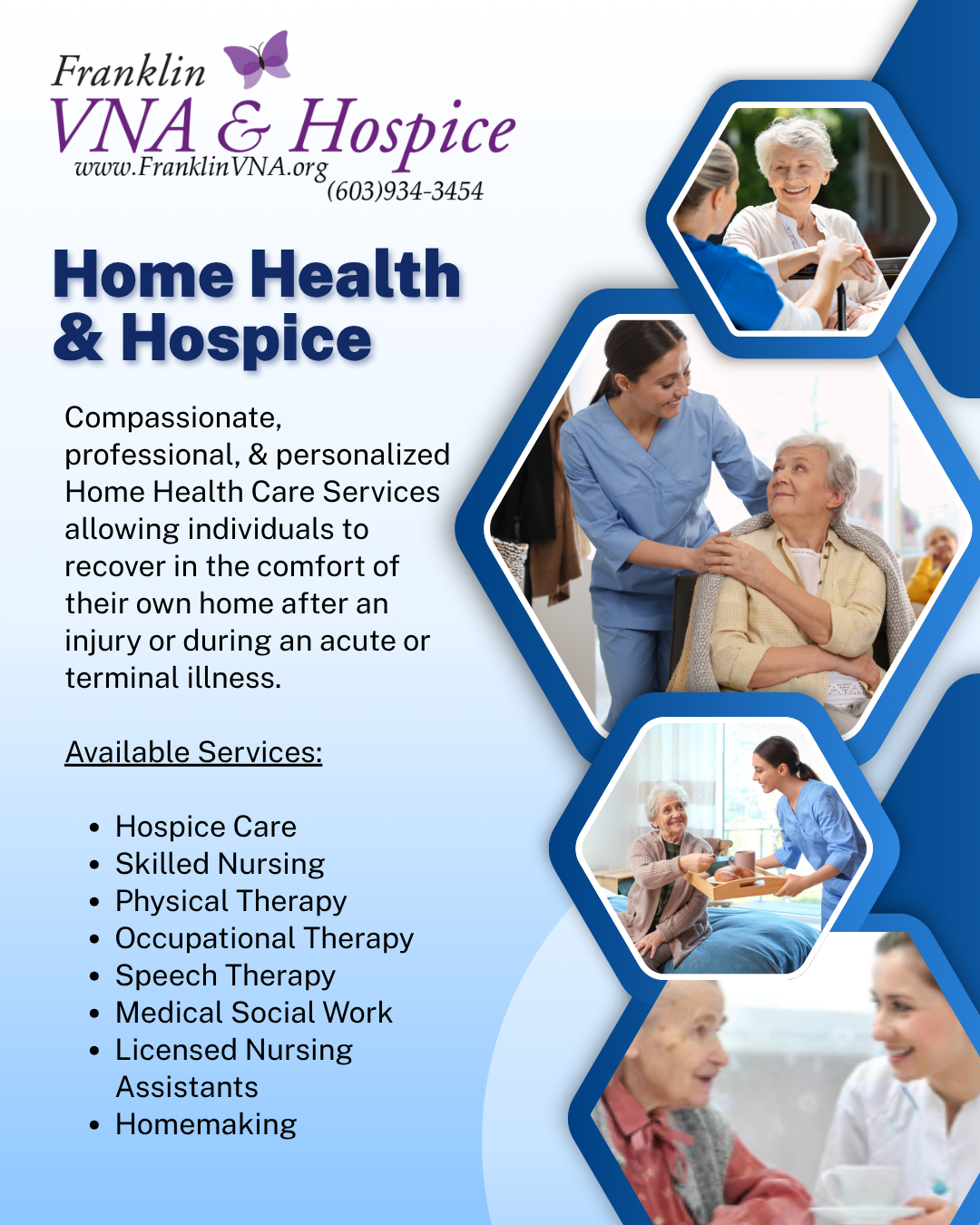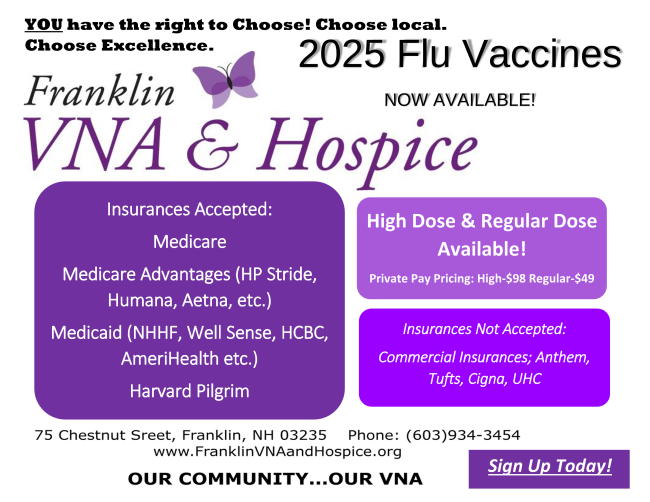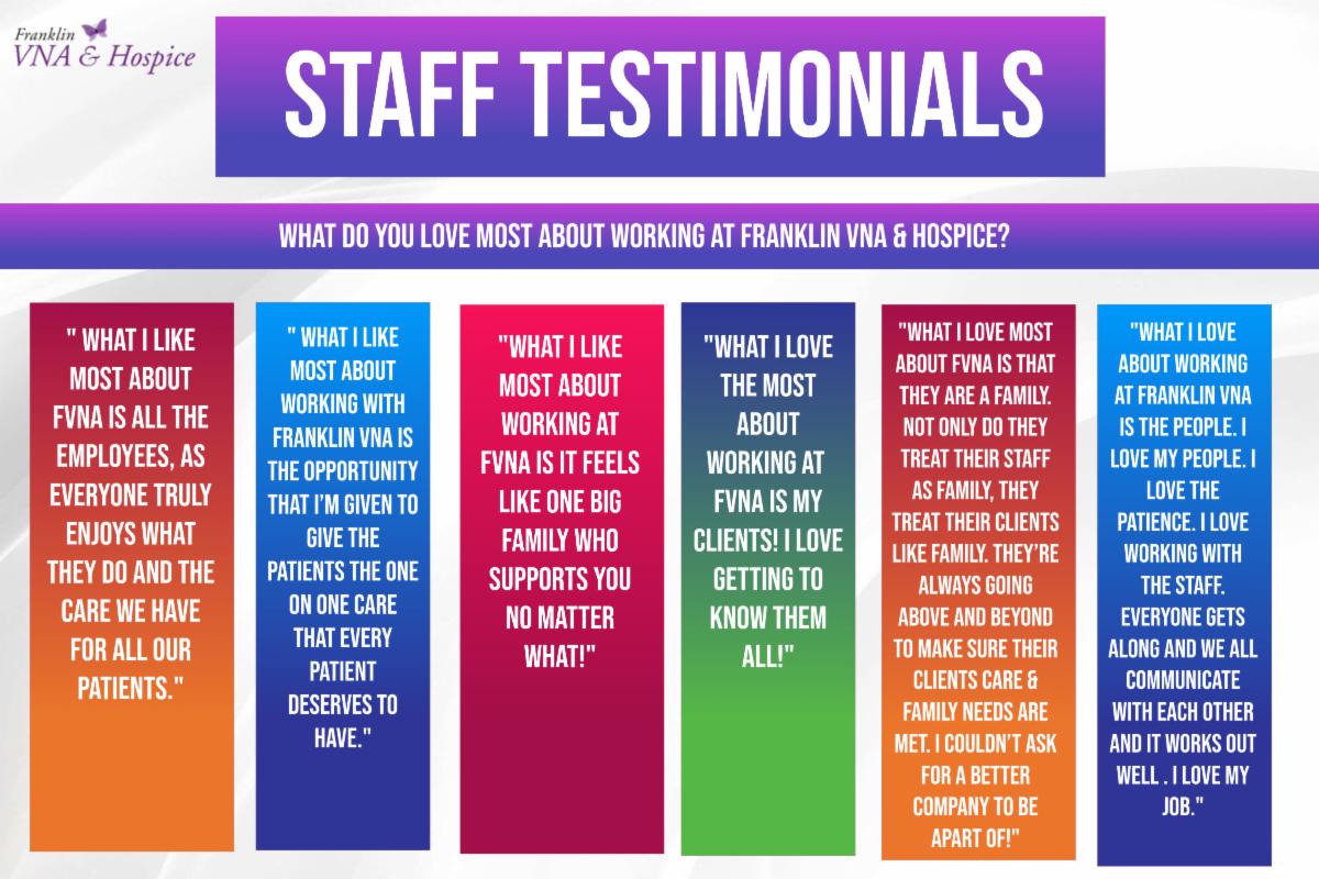 Thank you for choosing Franklin VNA and Hospice as your Home Health and Hospice agency and for sharing your experience with our services with others. It is because of you that we are able to continue to remain a small independent hometown agency.