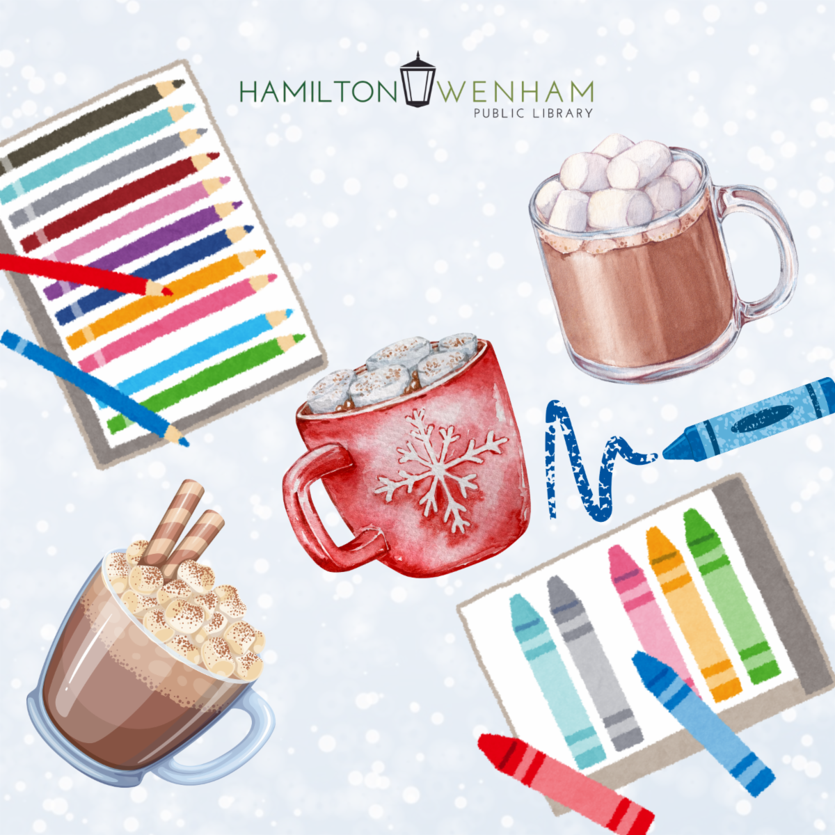 Art supplies and a variety of coloring pages will be available. Plus stop by our hot cocoa station to create a cozy treat.