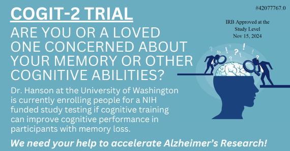 We are currently looking for volunteers to participate in a study run by Dr. Angela Hanson at the University of Washington: The COGIT-2 Trial. COGIT-2 is a research study looking at whether crosswords puzzles training and health education can improve cognitive performance in participants with memory concerns. | |