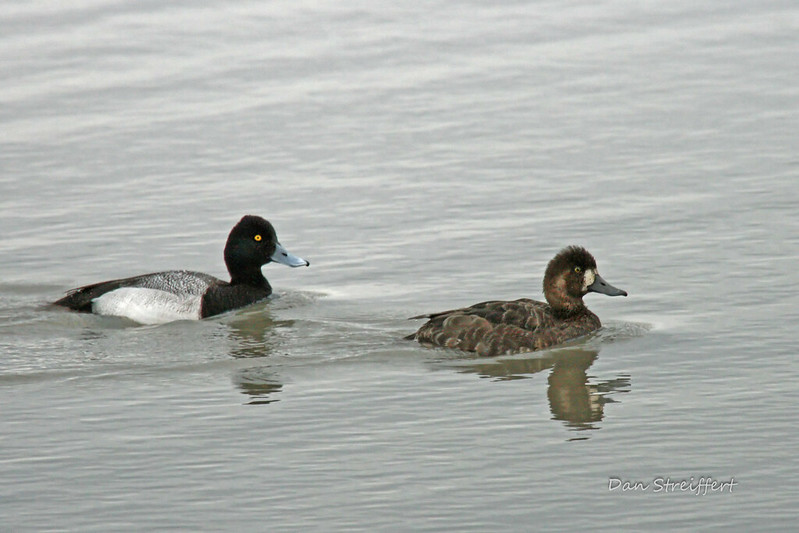 The lesser scaup (Aythya affinis), also known as the “little bluebill,” is a medium-sized diving duck in the family Anatidae found across North America. Males have a blue-gray bill, yellow eyes, and a black head with a purple iridescent sheen. Females are brownish, with a white patch at the base of the bill.