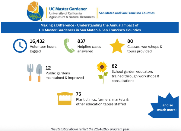 We are deeply grateful for your generosity during this year’s Giving Tuesday. Your contribution directly supports the San Mateo / San Francisco Counties Master Gardener Program and projects—much of which is self-funded. Our shared passion for growing things is what brings us together and inspires the work we do!