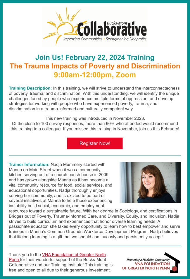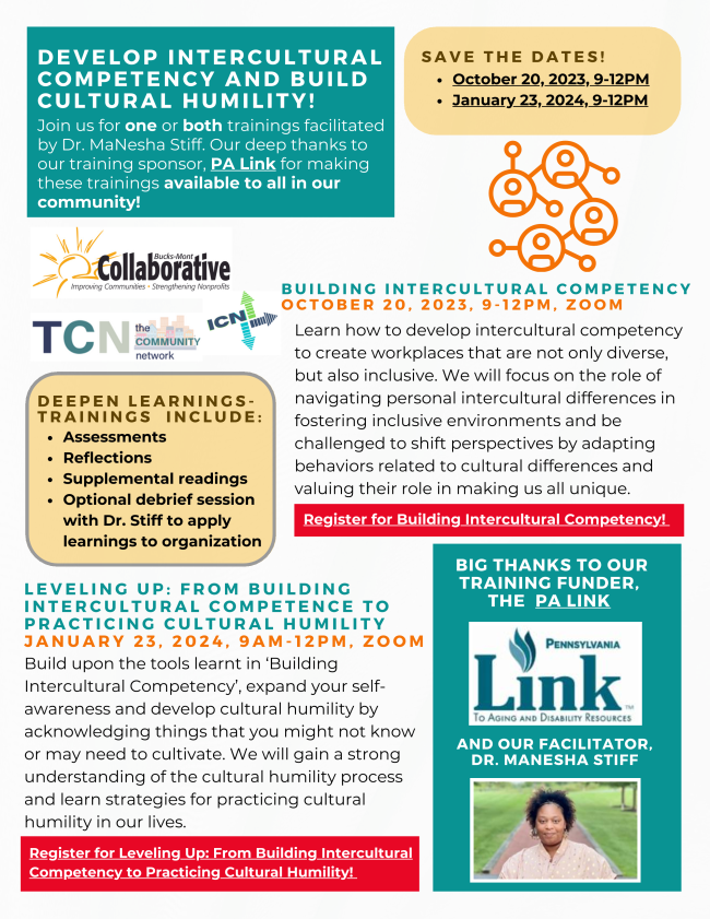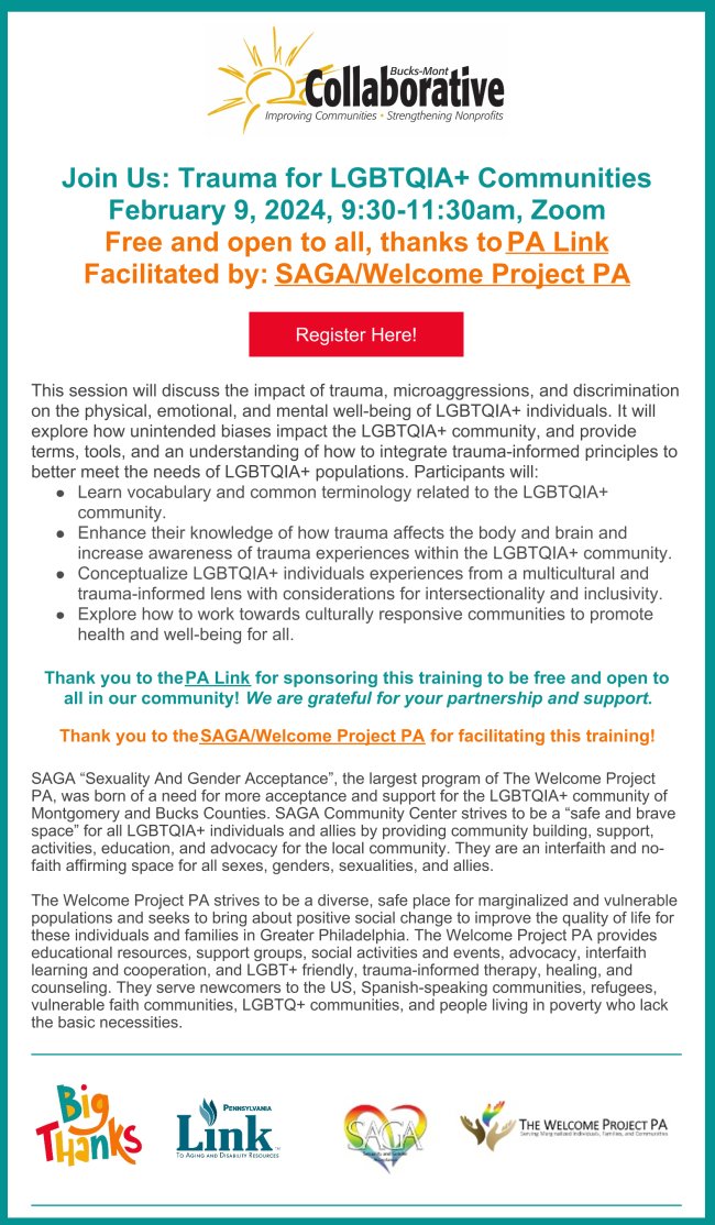 Please continue to keep us informed of what's happening with you in Bucks and Montgomery Counties. The information here comes from you, with links to our website for more complete information and resources. Send your events and updates to Kristyn: kristyn@bucksmontcollab.org. Thank you!