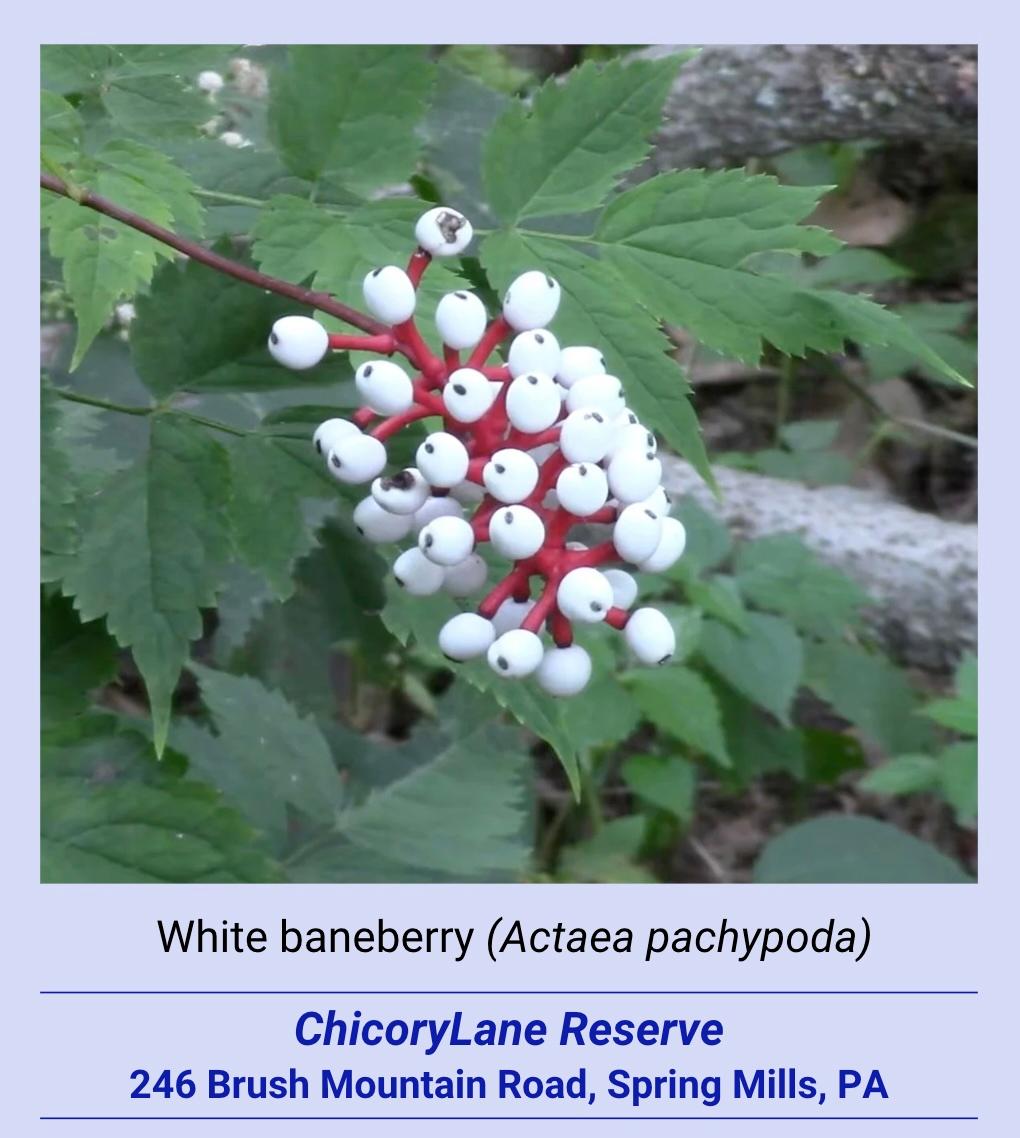 IMAGE: White baneberry or doll's-eye (Actaea pachypoda). This eastern North America native grows in leaf litter under tree canopy at ChicoryLane. Less robust and persistent than its relatives black cohosh and blue cohosh that grow in patches, a solitary white (sometimes red) baneberry plant can startle walkers on paths here in late summer. Photo credit: ChicoryLane Collection