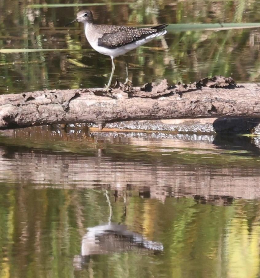 Over 35 visitors attended the final Bird Walk of the year. The fall landscape offers the best opportunity to witness the late season’s antioxidant-rich berries prized as food by migrating birds. Clusters of deeply colored, especially blue and purple, berries are easy-to-spot food sources for birds, even from a distance. Raptors such as the Cooper’s Hawk (Astur Cooperii) soared overhead. Visitors identified 111 birds of 41 species, both visually and by calls. The day's inventory can be viewed here. Image: A Solitary Sandpiper (Tringa solitaria) rests on a vernal pool log. Photo credit: Debra Rittelmann.