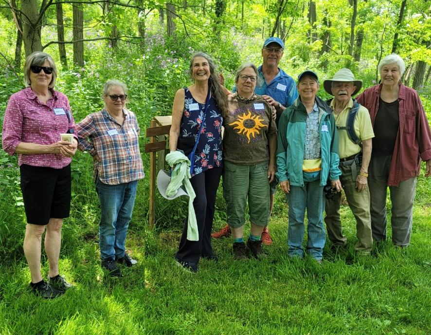 ChicoryLane welcomed nearly 30 visitors to a sunny, early summer Open Day offering a diverse menu of activities—on-your-own trail walks, a series of three guided walks, and talks on ChicoryLane's historic log home, old field ecology and land use history. (Image: group heading to the hilltop 360° view walk)