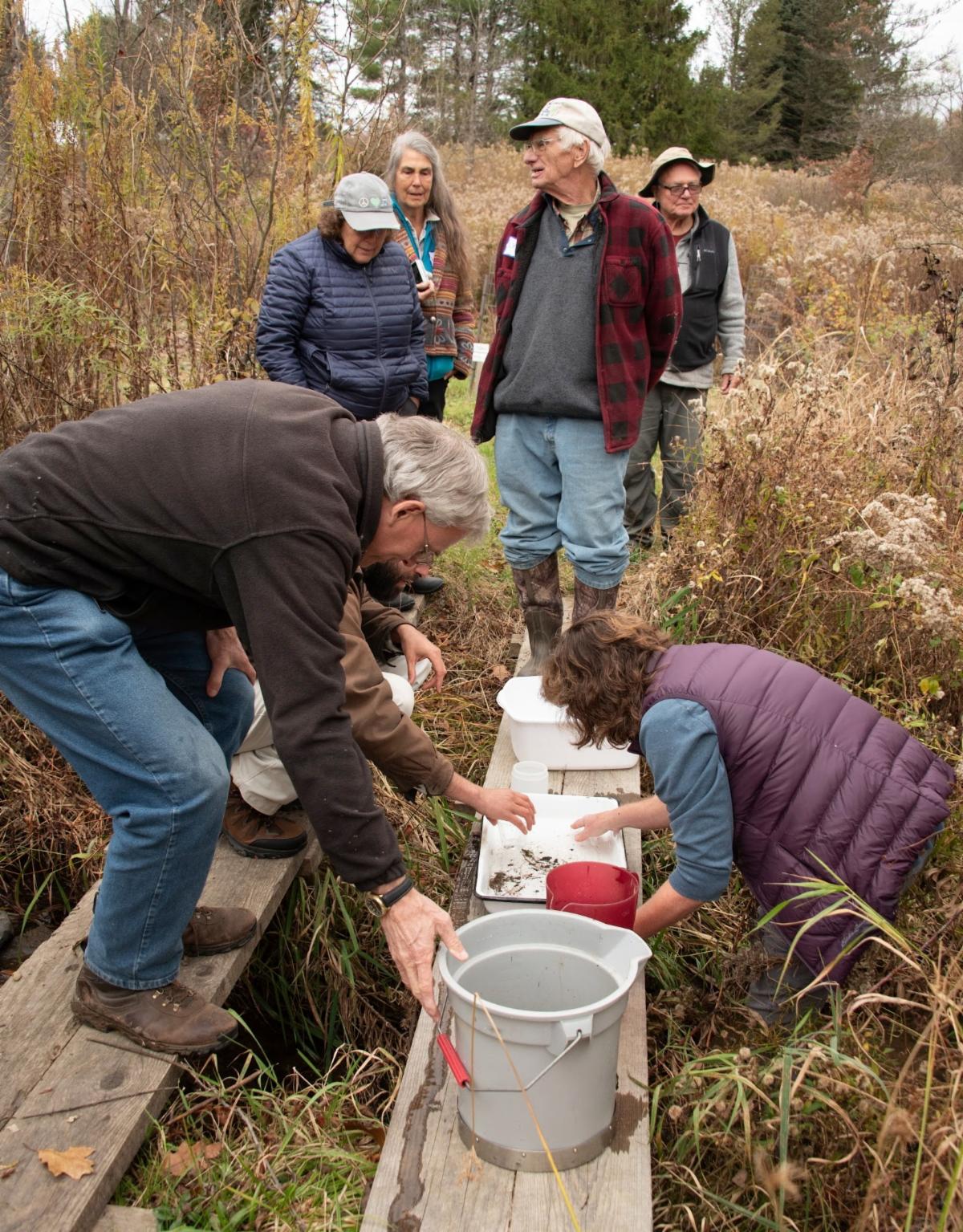 Over 40 visitors explored ChicoryLane’s waterways in relation to habitats. Rick Henry, hydrogeologist, explained ChicoryLane’s geology; what's happening to the water before it enters the property, while it traverses through the property, and its fate downstream. Rick also explained ChicoryLane’s special geology that creates habitat for moisture-loving plants and animals. Adam Smith, fish and wildlife biologist, explored the vernal pools he designed in the 1990’s. Using surface water flows, the constructed pools convert an old farm field to habitat for salamanders, newts, turtles, muskrats, herons and other bird species, frogs and dragonflies. Suzy Yetter, ecologist, led a hands-on field activity to explore the tiny creatures living in ChicoryLane's cold-water streams. Visitors were introduced to macroinvertebrates such as mayflies, stoneflies, and caddisflies as natural indicators of water quality. They also offer clues about how land use affects waterway health. Photo credit: Bill Rathfon
