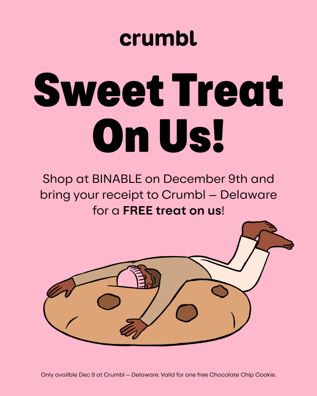 This month, we have partnered with Crumbl - Delaware! On Tuesday, December 9, shop at BINABLE and then take your receipt (dated 12/9) to Crumbl for a free cookie.