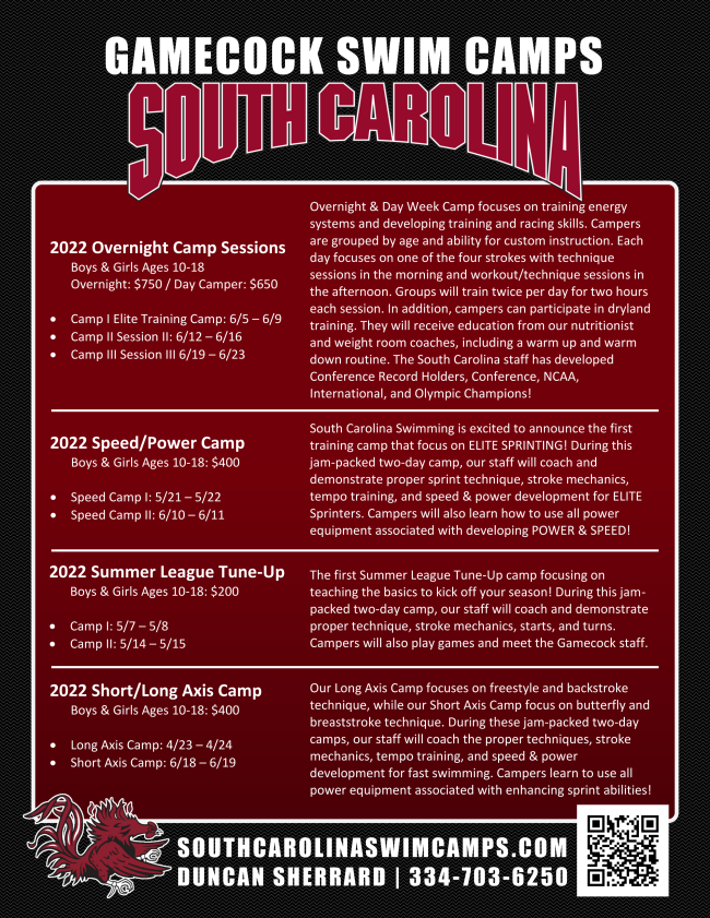 University of South Carolina Swim Camps are back for 2022! This year's camps include Overnight Camps, Speed & Power Camps, Summer League Tune-Ups and Long & Short Axis Camps. For more information, visit SouthCarolinaSwimCamps.com.