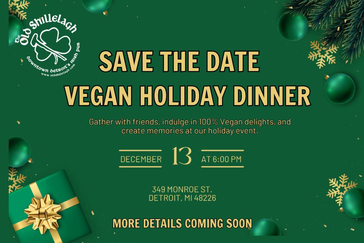 Our friends at The Old Shillelagh are hosting a Vegan Holiday Dinner on Saturday, December 13, 6pm - 9pm, at 349 Monroe St., Detroit. Parking is free at Hollywood Casino Greektown. Tickets are $39 each (plus Eventbrite fees) and include admission, a dinner plate with a scratch-made protein, mashed potatoes with gravy, green beans, yams, biscuit, carrot cake for dessert, and fountain drinks or water. Get Tickets and Event Details Here.