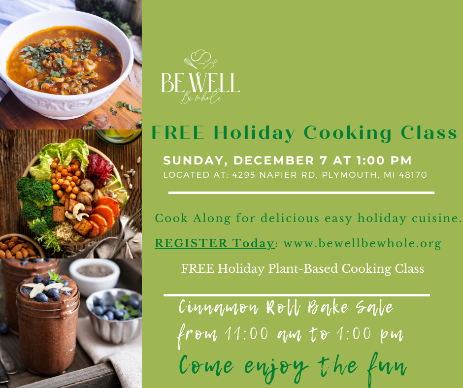 Longtime VegFest vendor, Be Well Be Whole, is offering a vegan holiday cooking class on Sunday, December 7, at 1pm, 4295 Napier Rd, Plymouth. There is a suggested contribution of $25 at the door. Seating is limited and will be available on a first-come, first-served basis. Please register at www.bewellbewhole.org. Prior to the class, from 11am to 1pm, Be Well Be Whole will host a vegan bake sale featuring their new cinnamon rolls in a variety of flavors, as well as banana bread.