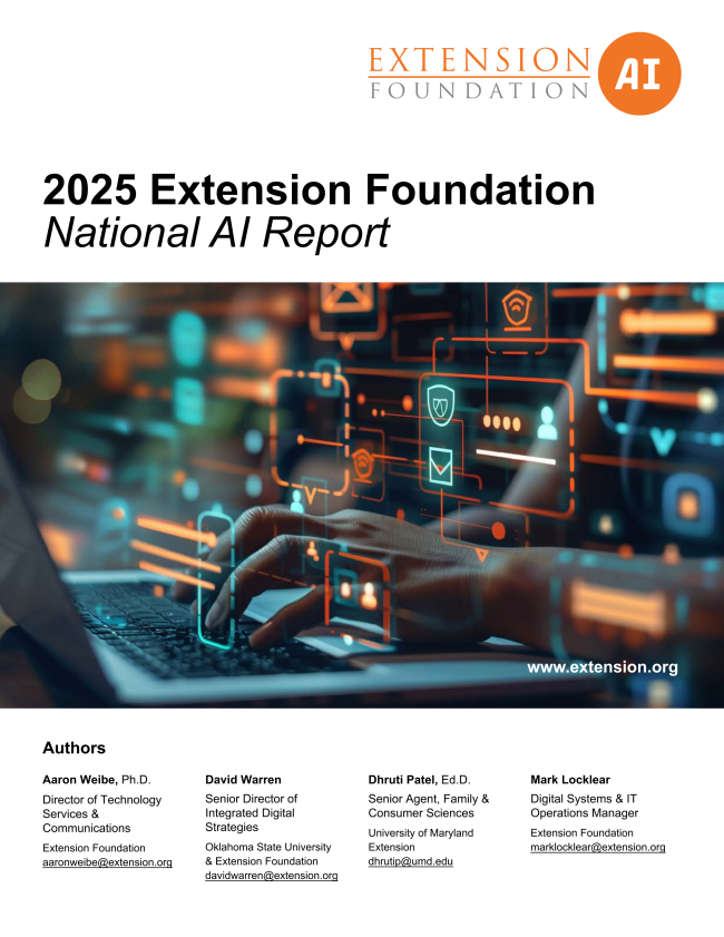 The Extension Foundation, in collaboration with the University of New Hampshire Extension, NTAE, NIFA, Oklahoma State University Extension, and the University of Maryland Extension, led a national effort to understand the current landscape of AI within the Extension Land-Grant University system. Read it here