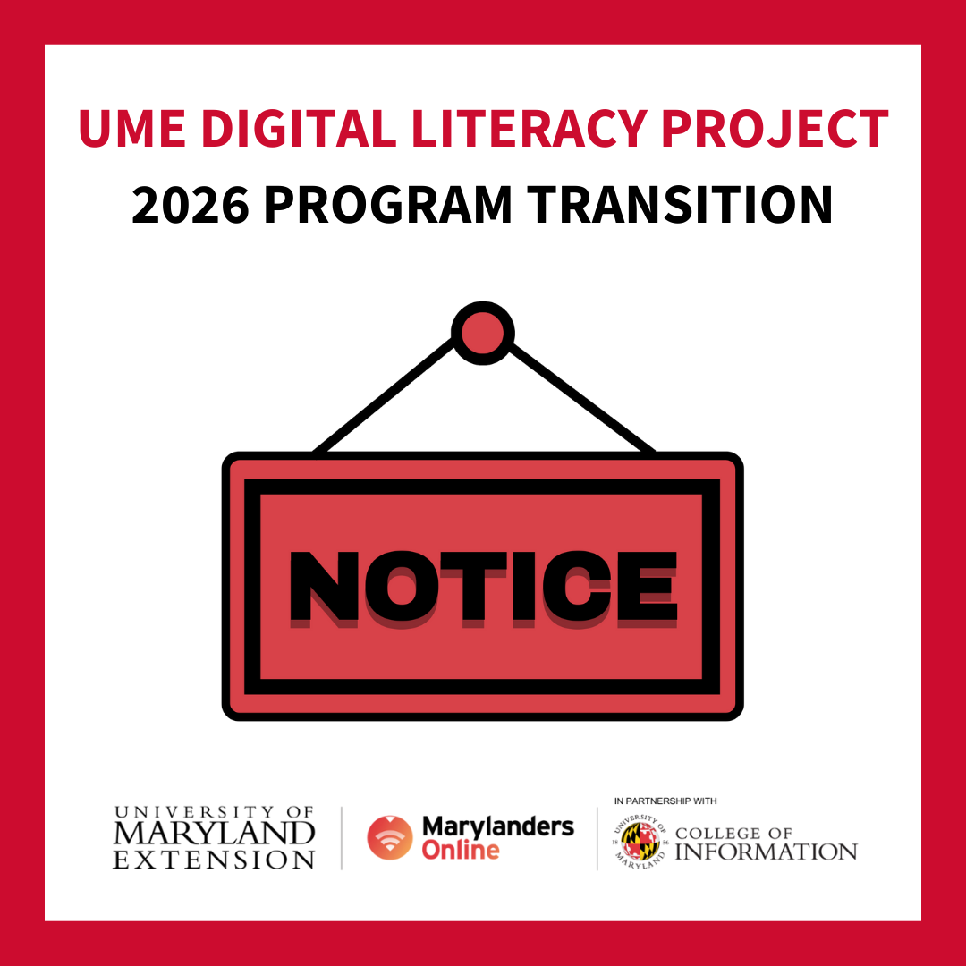 | | | | Program Transition Notice | | | | Beginning January 2026, the University of Maryland Extension (UME) Marylanders Online digital literacy projects will enter a planned transition phase. During this time, the project will operate at reduced capacity and shift to a consultative model focused on long-term sustainability, resource refinement, and program quality. Read more | | | |