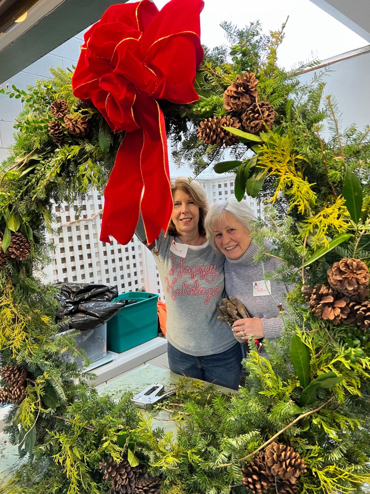 left: Anne Tropeano and Robin Miner hold up a large wreath that will adorn the Police Station.