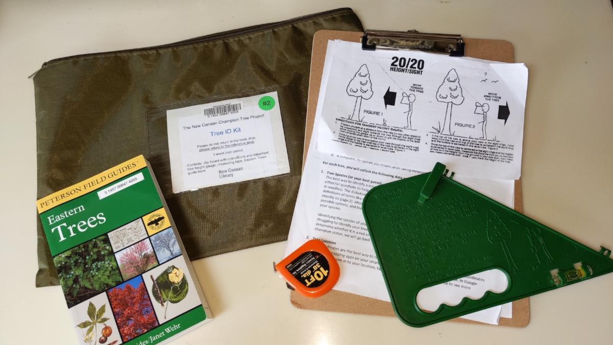 The New Canaan Library has Tree Identity Kits to borrow. Inside each kit is the Peterson Eastern Trees field guide, a tangent gauge, measuring tape, clip board and notes on the New Canaan Champion Tree Project - to record the size of of our trees.