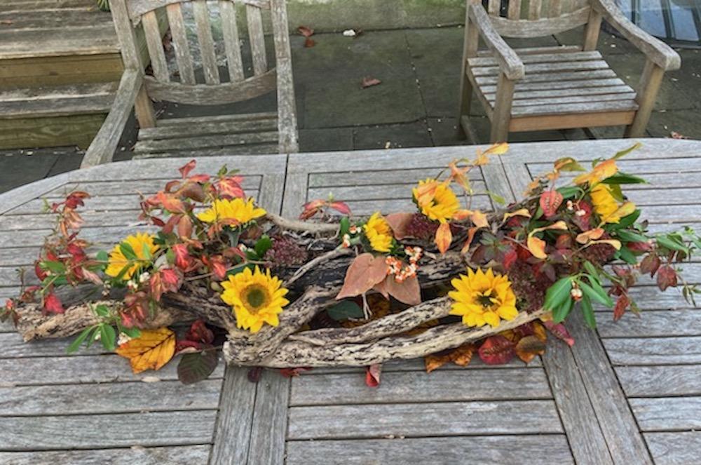 A stunning centerpiece created by Stephanie and Kathy L, made with a fallen branch and autumn flowers and leaves.