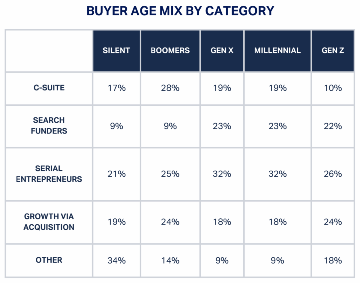On the buy-side, however, the age curve bends sharply younger. Millennials and Gen Z make up large portions of search funders (45%) and serial entrepreneurs (58%), signaling a new generation of professional buyers eager to acquire and scale. Even at the corporate level, nearly a third of C-suite buyers are under 45.
