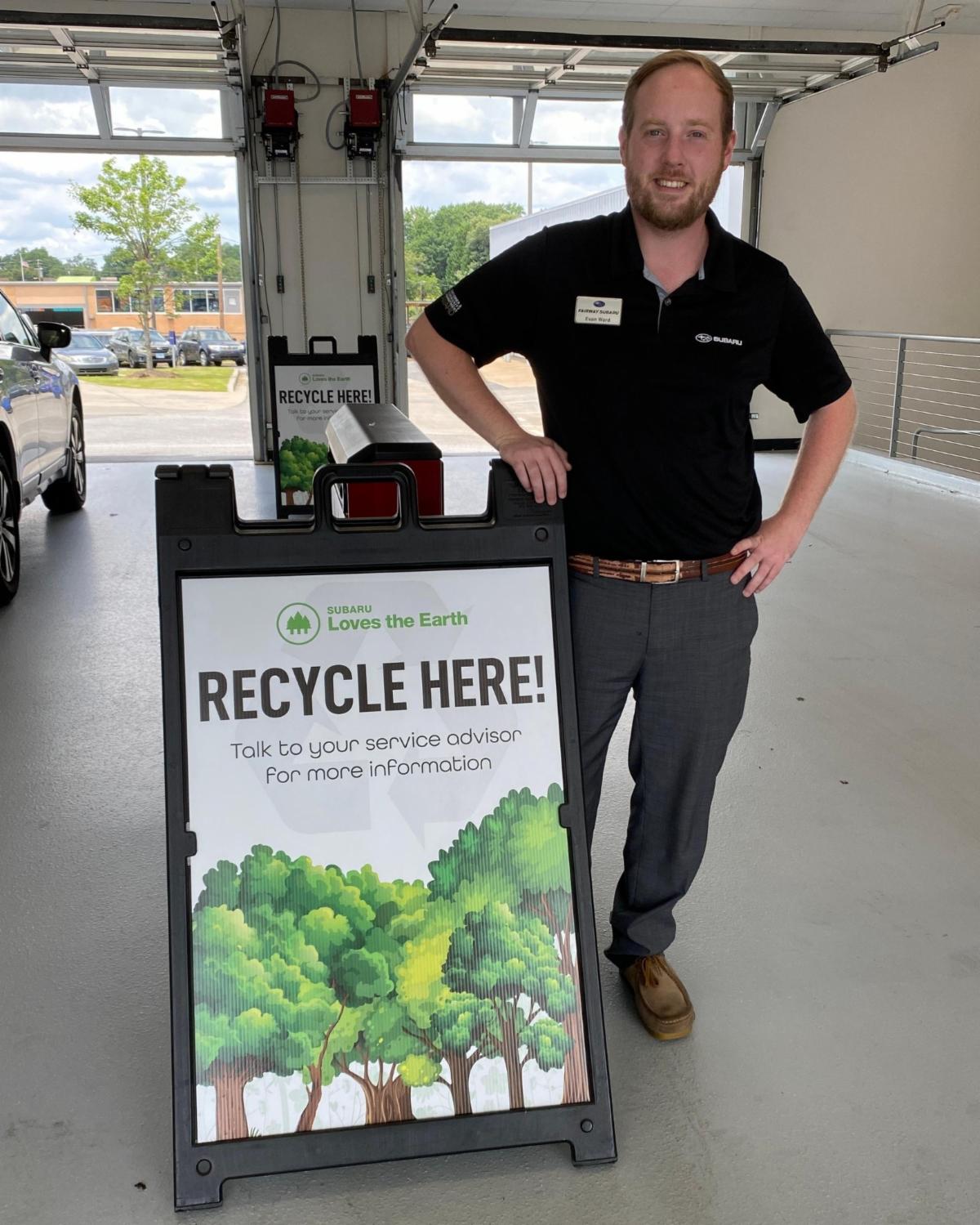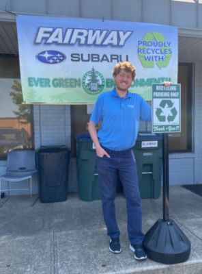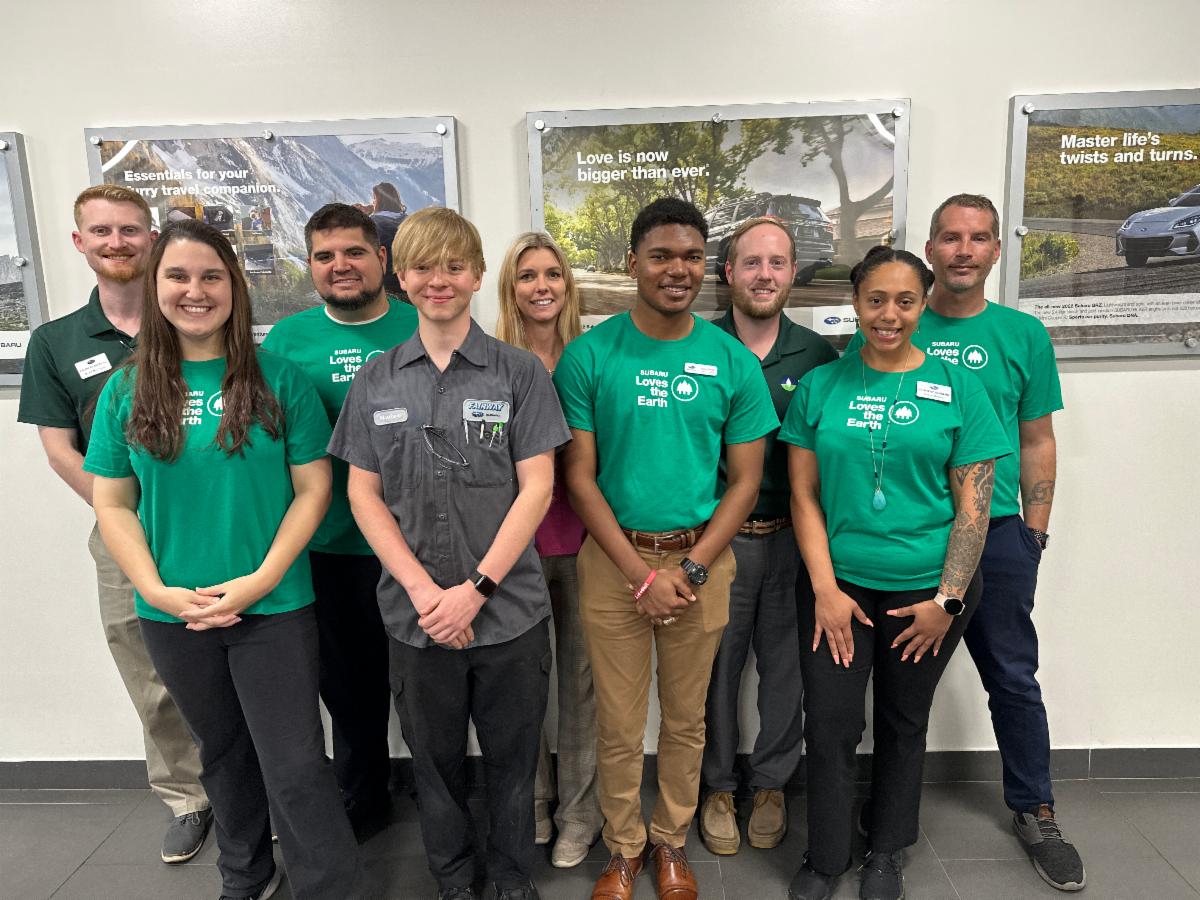 The Green Team (L to R: Brad Mulligan, Kate Fickell, Zack Sizemore, Matthew Brownle, Angela Plumley, Justus Webb, Evan Ward, India Byers, Jay Ely) meets once a month to ensure that Fairway Subaru keeps on track with the Subaru Loves the Earth Promise and maintains their certified Subaru eco-friendly retailer status.