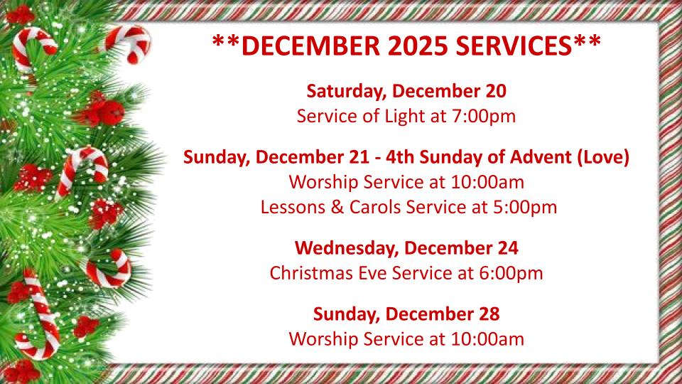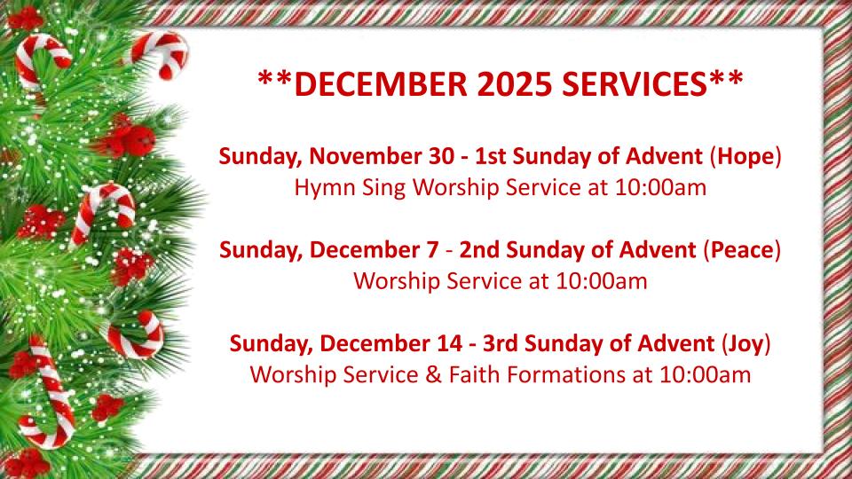 Another sort of “song of the month” will be our Advent Candle-lighting Sung Response. After a specialized reading and candle lighting, we will sing the chorus of “Jesus, Name Above All Names”, just as we did on the 1st Sunday of Advent in the Hymn Sing Service. Listen to a recording with the lyrics HERE. Also this month, we will continue to use the “3-Fold Amen” (#312 in Chalice Hymnal). We will sing this together each week after the Closing Prayer and Blessing. Listen HERE.