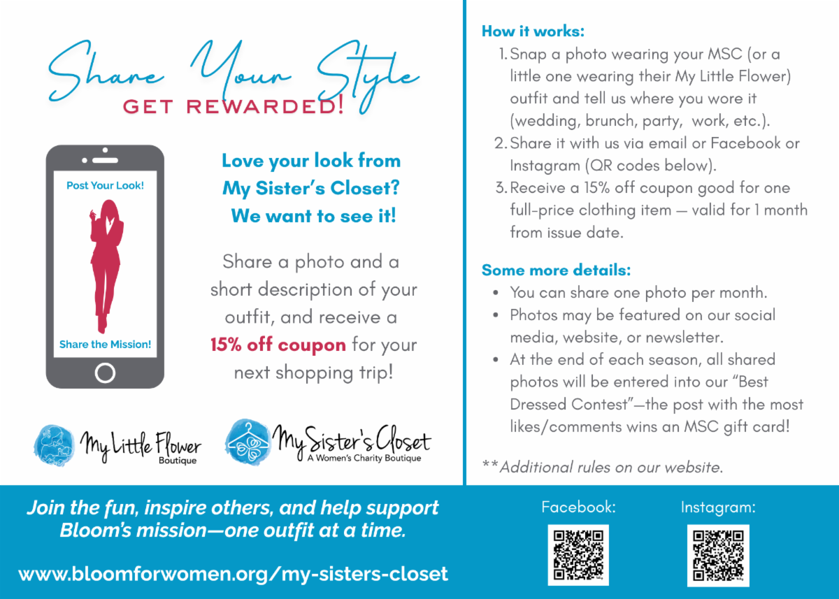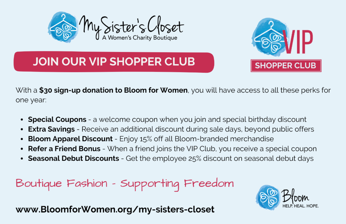 This holiday season, as always, to our long-time shoppers as well as those of you who recently discovered My Sister’s Closet, we thank you from the bottom of our hearts for supporting the mission of Bloom for Women by shopping at My Sister’s Closet!