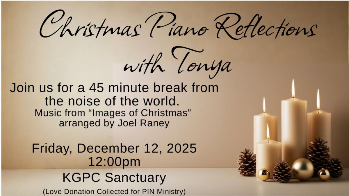 Friday Dec. 12th - "Images of Christmas" Piano Reflections at noon in the sanctuary: Take a 45-minute break from the bustle and noise of the world. There will be fresh new arrangements of Christmas favorites by Joel Raney and an optional opportunity to give a love offering for the PiN Ministry.