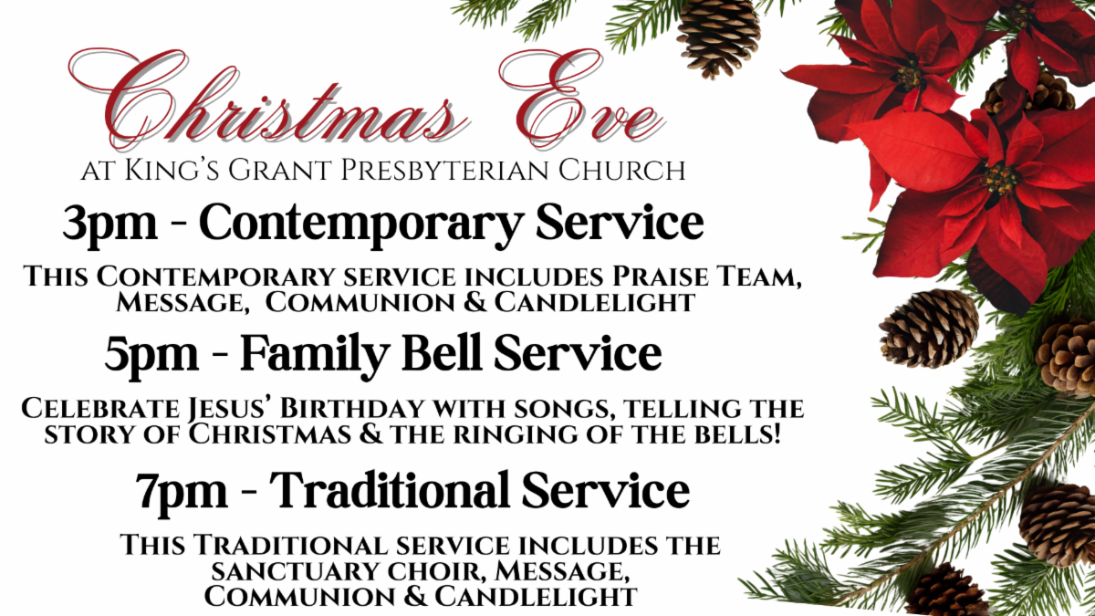 Wednesday Dec. 24th Christmas Eve - Our 3:00pm Contemporary Service will be led by the Praise Team with exciting arrangements of widely loved Christmas music, the 5:00pm Bell Service will delight Children and parents as we continue this time-honored tradition for families, and the 7:00pm Candlelight Service will bring warmth and joy to your Christmas celebration.