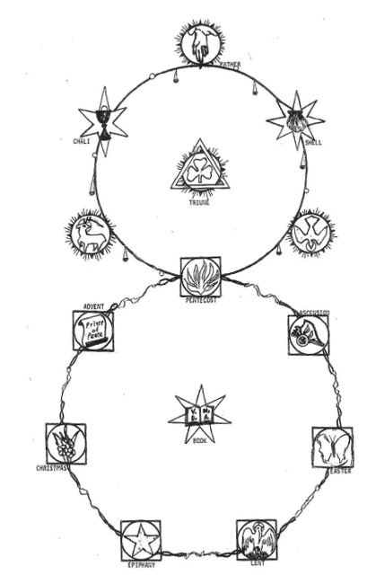 The Christian Year Series is composed of 14 Chrismons forming a large double loop or figure 8. The upper loop of the figure 8 proclaims the Triune God, who is the one God made known to humanity in three different ways. The lower loop shows God's revelation in the incarnation of the man, Jesus.