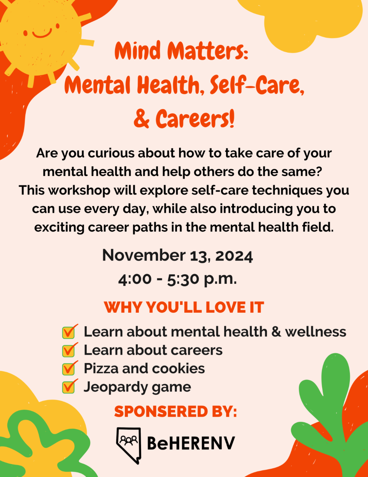 On November 13th, Dr. Jill Manit presented a workshop for UNR Upward Bound students, where 30 students registered, and a waitlist quickly formed! The session covered essential mental health information and career opportunities, followed by an energetic round of Jeopardy to test students' knowledge. We’re grateful to Upward Bound for the chance to connect with their amazing students and are excited about future workshops. Earlier that same day, Dr. Manit joined Mrs. Roni Green, the Human & Social Services CTE teacher at Reed High School, for “Raider Con,” an event where students explored college and career paths. This collaboration between BeHERE and Reed High School showcases the benefits of education-industry partnerships! | |