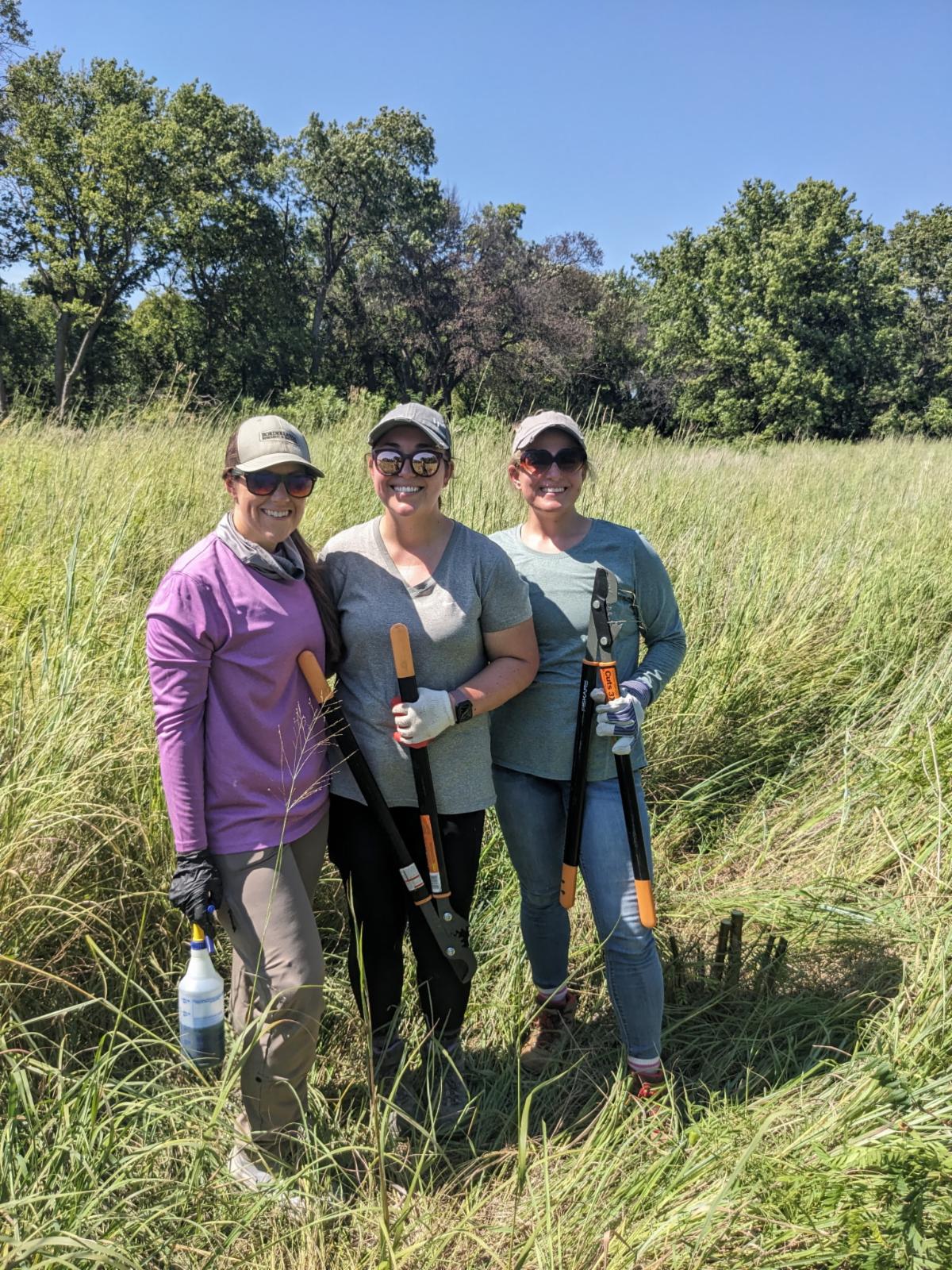 Despite temperatures topping out at ninety-nine degrees, a small group of committed volunteers from the local Lincoln County Women on the Wing chapter of Pheasants Forever showed up at the Connie Achterberg Wildlife-Friendly Demonstration Farm to help combat woody encroachment in restored grasslands across the property. While new woody encroachment is most efficiently kept in check with prescribed fire, sometimes Mother Nature needs a helping hand in removing established trees and shrubs. With the help of these volunteers we will be able to conduct more efficient burns, promote the growth of native grasses and forbs, and create healthy prairies to be enjoyed by humans and wildlife alike! To keep cool while working, volunteers spent some time exploring the woodlands surrounding Bullfoot Creek and enjoying the shade of towering burr oaks, green ash, and hackberry trees.