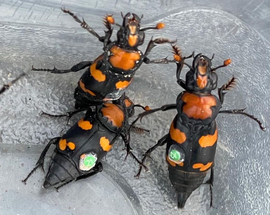 These striking insects, nearly two inches long, are a threatened species whose populations have declined due to habitat loss and light pollution. Both parents work together to bury small carcasses, raise their larvae, and in doing so, reduce fly populations—a service appreciated by ranchers.