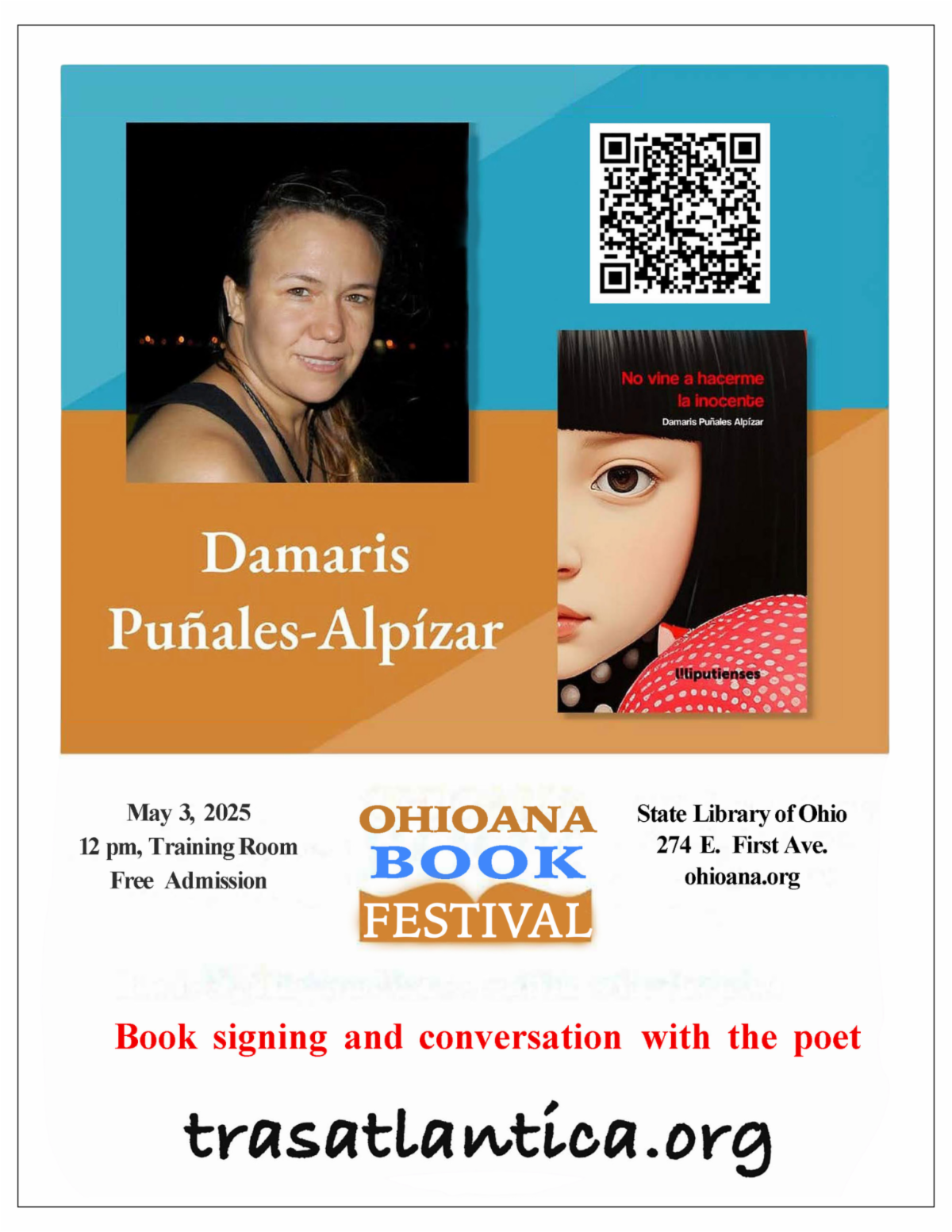 Poetry Panel Voices of Ohio. Five talented poets and storytellers discuss the power of language, identity, and place, deep diving into the diverse landscapes and voices shaping the Buckeye State’s poetry scene. Panelists: Ajanaé Dawkins, Yalie Saweda Kamara, Damaris Puñales-Alpízar, and Scott Woods. Moderator: Lyn Ford. Ohioana Book Festival. State Library of Ohio, Columbus. May 3, 2025.