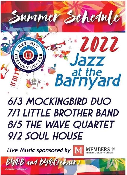 Jazz at the Barnyard at the Hershey History Center returns on the first Fridays of June, July, August, and September! Bring your friends, your chairs, and your beverage of choice, and relax with great music from some of Central PA’s best jazz musicians. The patio opens at 6 pm and the music is from 7-10 pm. Enjoy the best views of the iconic Hershey smokestacks and cocoa bean silos. The event is free and donations are encouraged. The entertainment schedule is June 3 – Mockingbird Duo, July 1 – Little Brother Band,