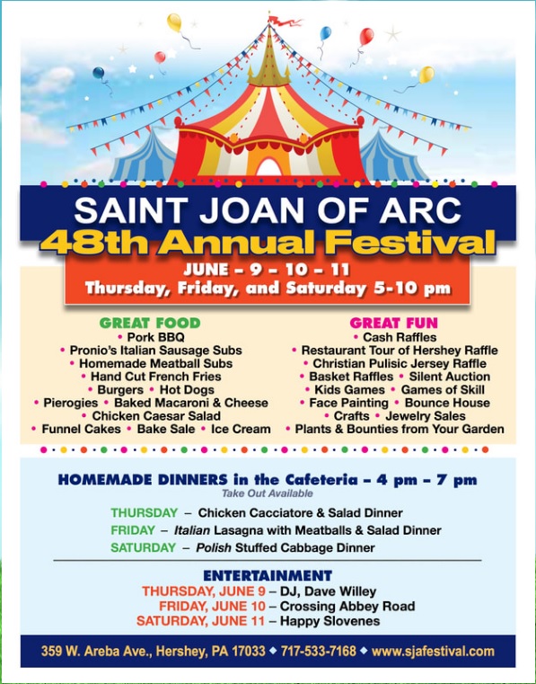 St. Joan of Arc Church 48th Annual Parish Festival for the whole family! Great homemade food. Children’s games and activities, kids inflatable, face painting, silent auction (including a trip to Sicily sicilywithfriends.com, games of skill, Bingo, Raffles: Cash, beautiful gift baskets, Hershey restaurants, authentic sports memorabilia, and a Christian Pulisic Jersey. Shopping of all kinds: jewelry, plants, garden bounties, bake sale, crafts, and more! Musical entertainment: Thurs June 9th- DJ Dave Willey; Fri June 10th – Crossing Abbey Road; Sat June 11th– Happy Slovenes. Location: 359 W. Areba Ave Hershey, PA 17033, (717) 533-7168 www.sjafestival.com.