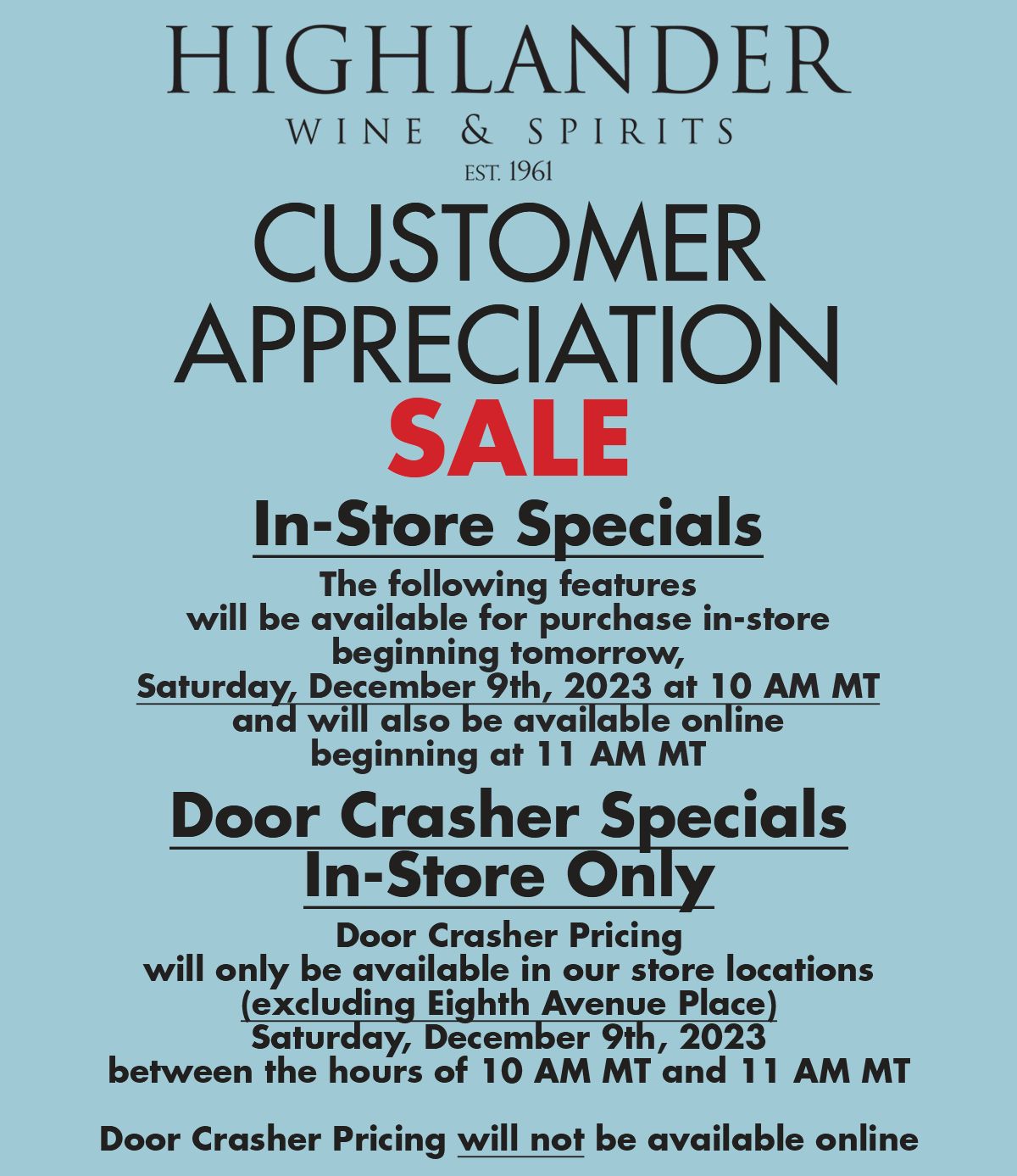 Products for sale and tasting may not be exactly as shown. We reserve the right to limit quantities. Products available on first come, first served basis. No holds. No further discounts apply. Pricing reflected does not include GST and deposit.