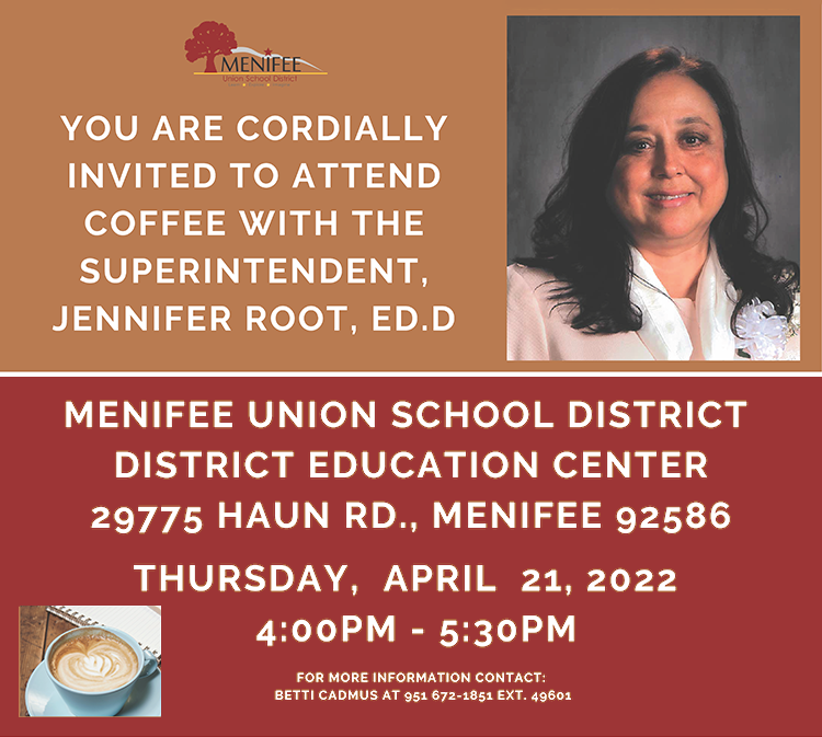 Menifee Union School District is inviting the community to meet with school principals, council members, ASB, PTO + PT(S)A leadership, and community business partners. Contact Betti Cadmus for more information at 951.672.1851 ext. 49601.