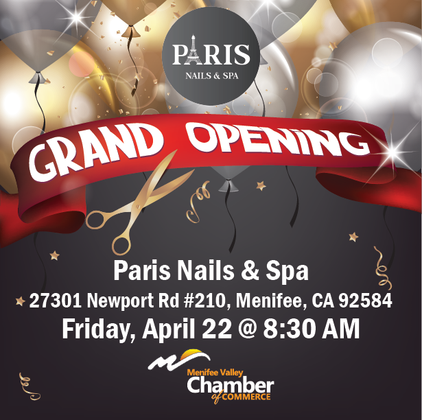 Join us as we celebrate Paris Nails & Spa with a ribbon-cutting ceremony. Visit our event page to set a reminder.