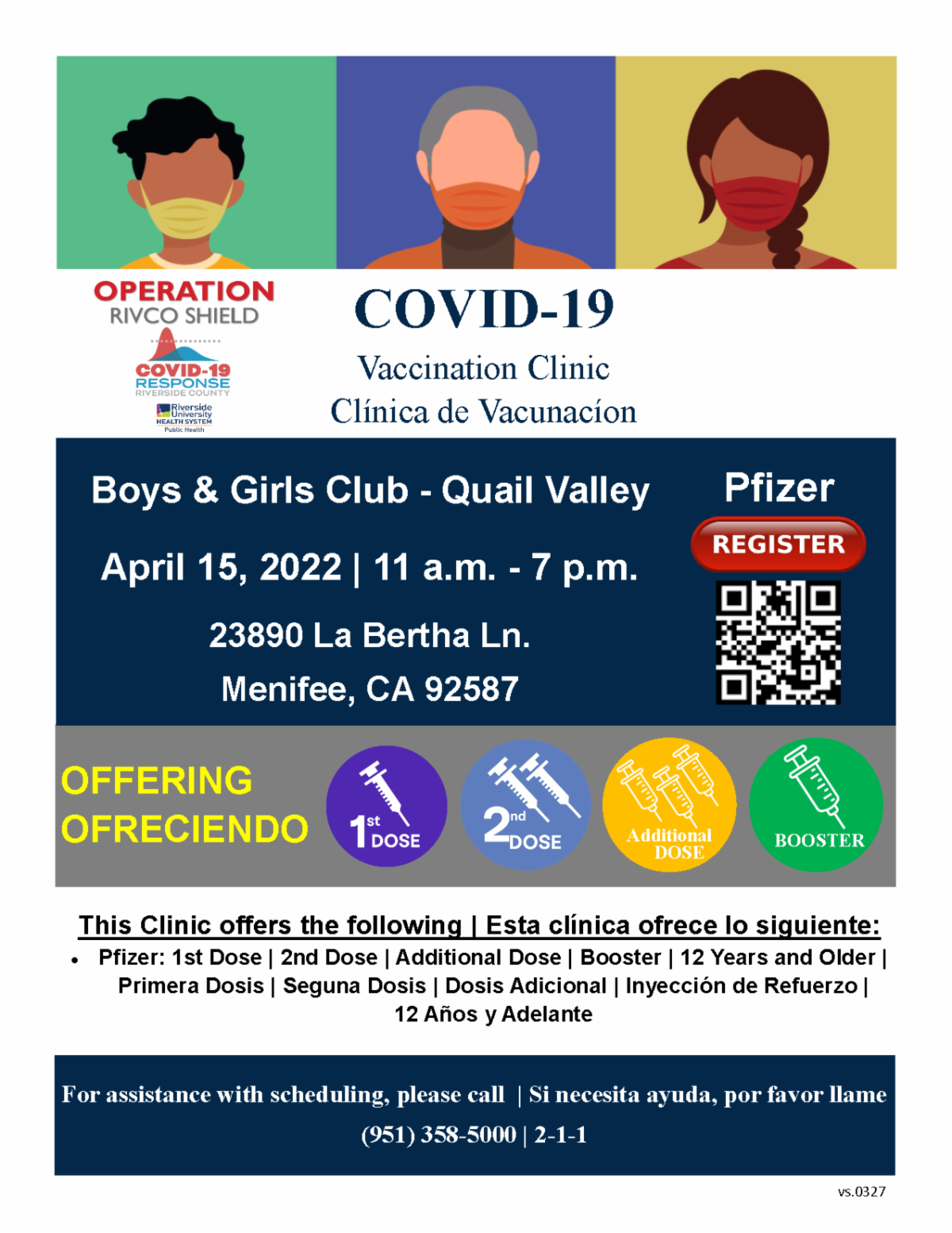 The Boys & Girls Club will be holding a COVID-19 vaccination clinic at the Quail Valley Clubhouse in collaboration with Riverside University Health System and the County of Riverside. 1st, 2nd, and additional doses of Pfizer are available as well as pediatric vaccines for children aged 5-11. Schedule your appointment