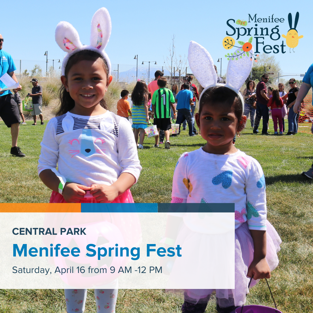 The community is invited to attend Menifee's Spring Fest on Saturday, April 16, from 9 a.m. to 12 p.m. Multiple egg hunts will take place for specific age groups and there will be a ribbon-cutting ceremony at 10 a.m. for the Paloma Wash Trail which was recently enhanced. Read full article here