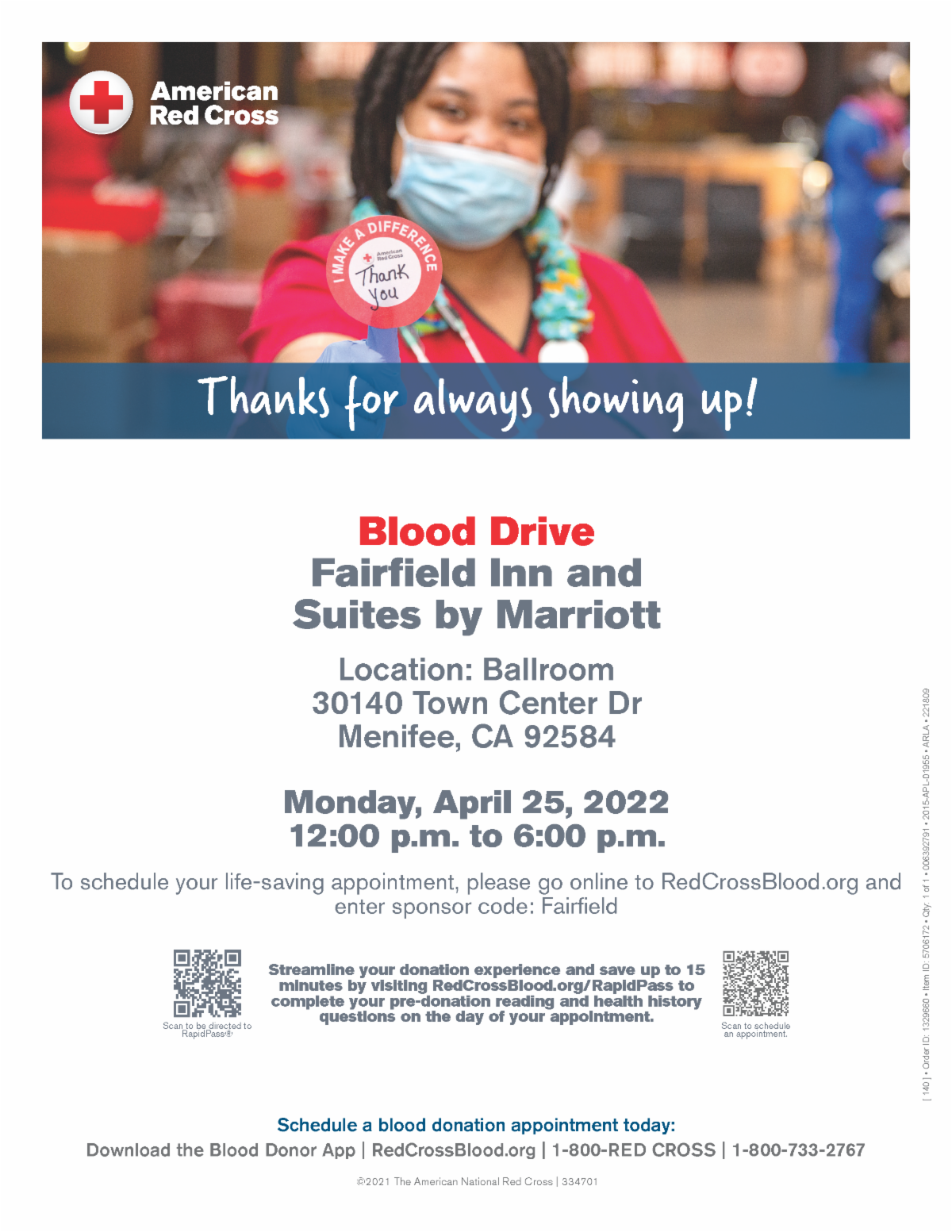 American Red Cross will be holding a blood drive at the Fairfield Inn and Suites. Blood donations will be handled by appointment. Visit redcrossblood.org to schedule your appointment today!