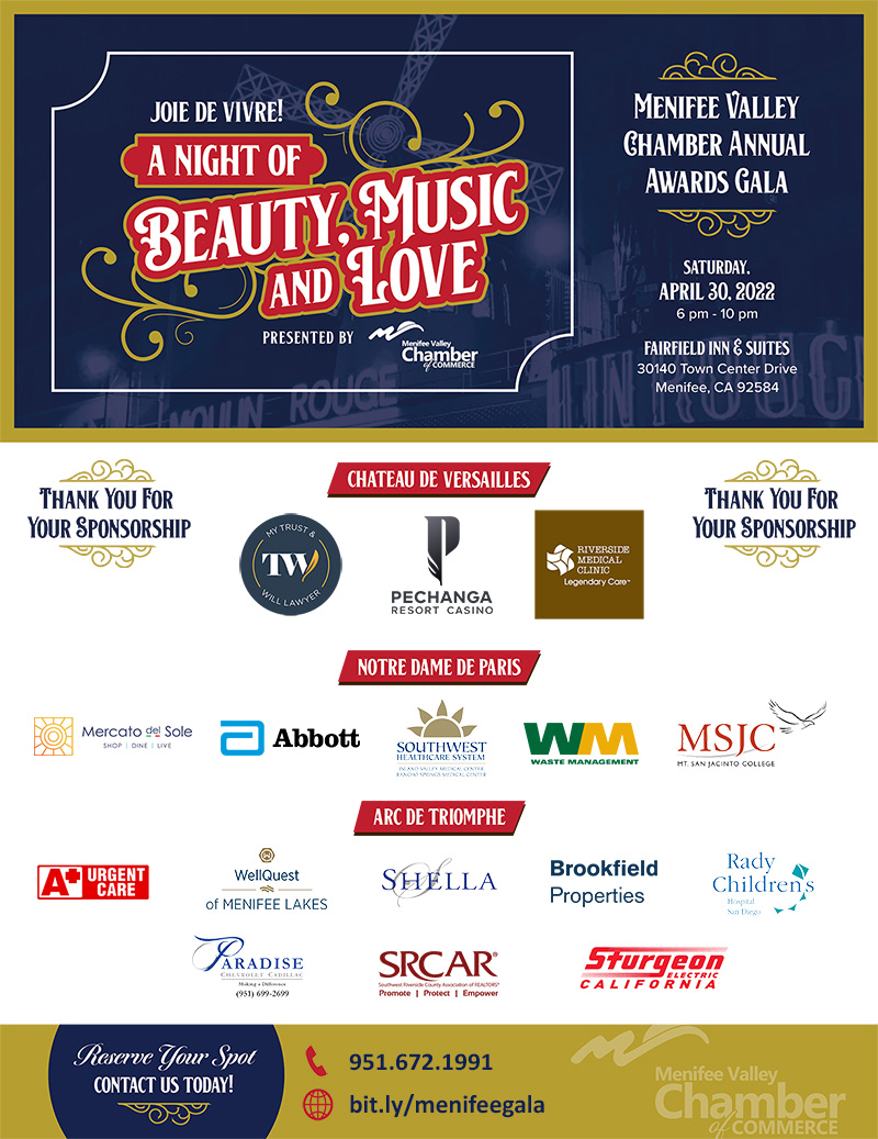 A variety of sponsorships are available for the 43rd Annual Menifee Chamber Business Awards Gala. The sponsorship deadline is approaching! All arrangements must be finalized by Friday, April 1. Purchase a Sponsorship or Tickets Here.