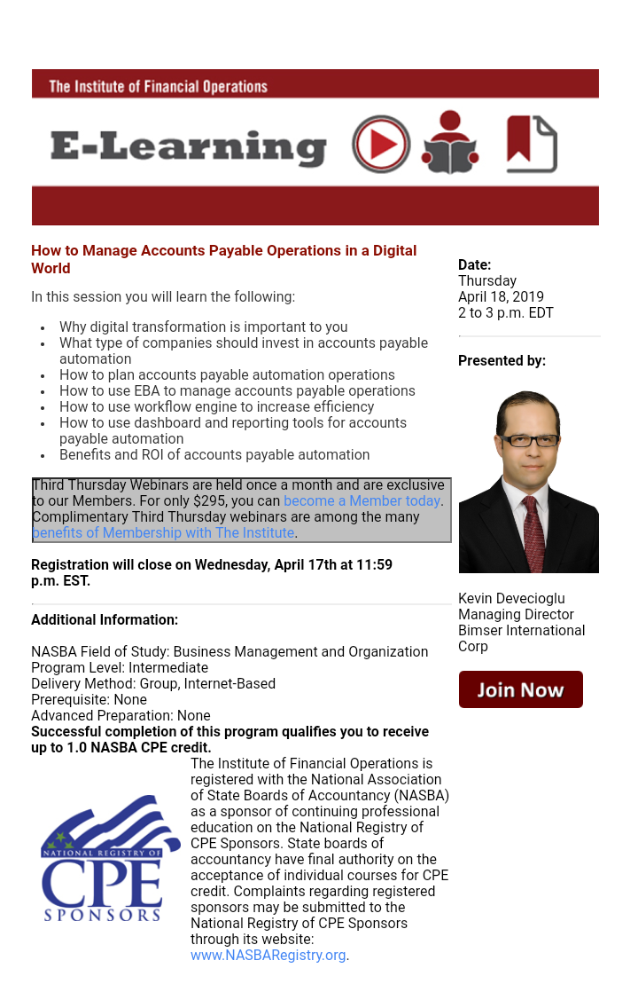 The Institute of Finance Operations invited Bimser International to address accounts payable operations, its benefits, technology and digital transformation in finance industry. Upon presentation, participants took a test and had a chance to get CPE credit.