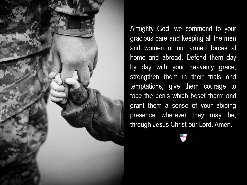 Almighty God, we commend to your gracious care and keeping all the men and women of our armed forces at home and abroad. Defend them day by day with your heavenly grace; strengthen them in their trials and temptations; give them courage to face the perils which beset them; and grant them a sense of your abiding presence wherever they may be; through Jesus Christ our Lord. Amen.