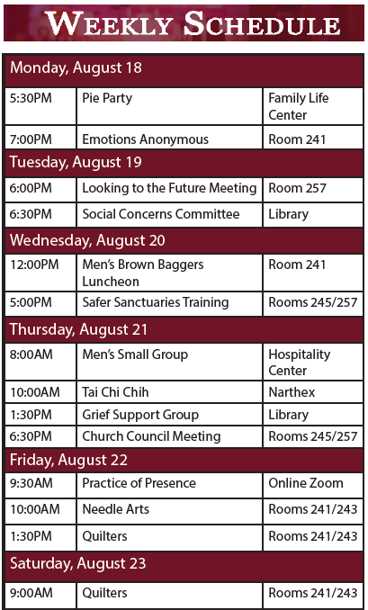 I still need pie bakers September 8-13. You bake pies during the day, then drop them off at the Family Life Center between 5 - 7 p.m. that evening. You may sign up on Sunday mornings, under the tent in front of the Sanctuary, or contact Debby Smith at (505) 554-4238 or dysmith0427@gmail.com. I will have the Pie Baking Instructions available on Sunday mornings or can email them to you.