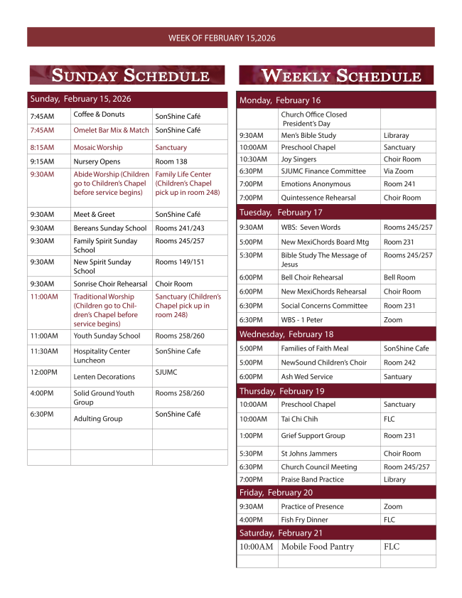 We Need You!: These dinners don't happen without our amazing volunteers. If you can spare a Friday evening (or two!), Wayne has sign-up sheets ready and waiting. See him at the Hospitality Center on Sunday morning or just reach out to him at jwshirleyabq@gmail.com.