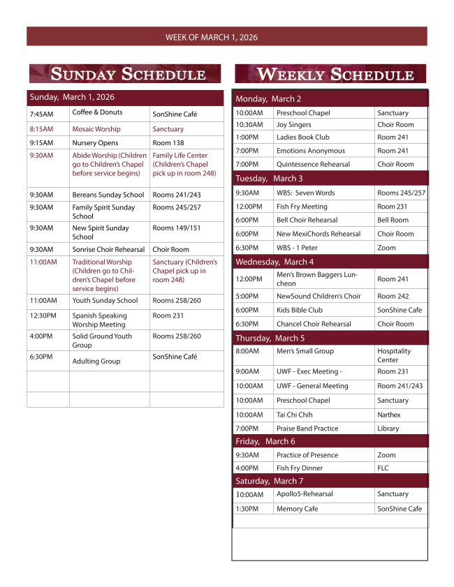 Memory Café meets the first Saturday of each month at 1:30pm -3:00pm in the Sonshine Cafe. It is a supportive fellowship for anyone affected by memory loss/Alzheimer’s and their caring partners. Meet and share with others on a similar journey. This is not a drop-off event. For more information (505) 323-7522 or ssmjens@aol.com. You don’t need to pre-register and there is no cost for the event. Join us for a fun time designed for you!
