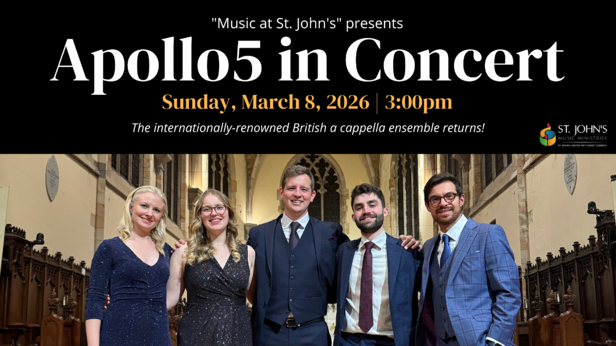 "Music at St. John’s" is proud to welcome Apollo5 for their third appearance on Sunday, March 8, 2026, at 3:00pm. This internationally award-winning British vocal ensemble captivates audiences with dynamic, versatile performances and a wide-ranging repertoire—from Renaissance and classical works to contemporary choral music, as well as folk, jazz, and pop.